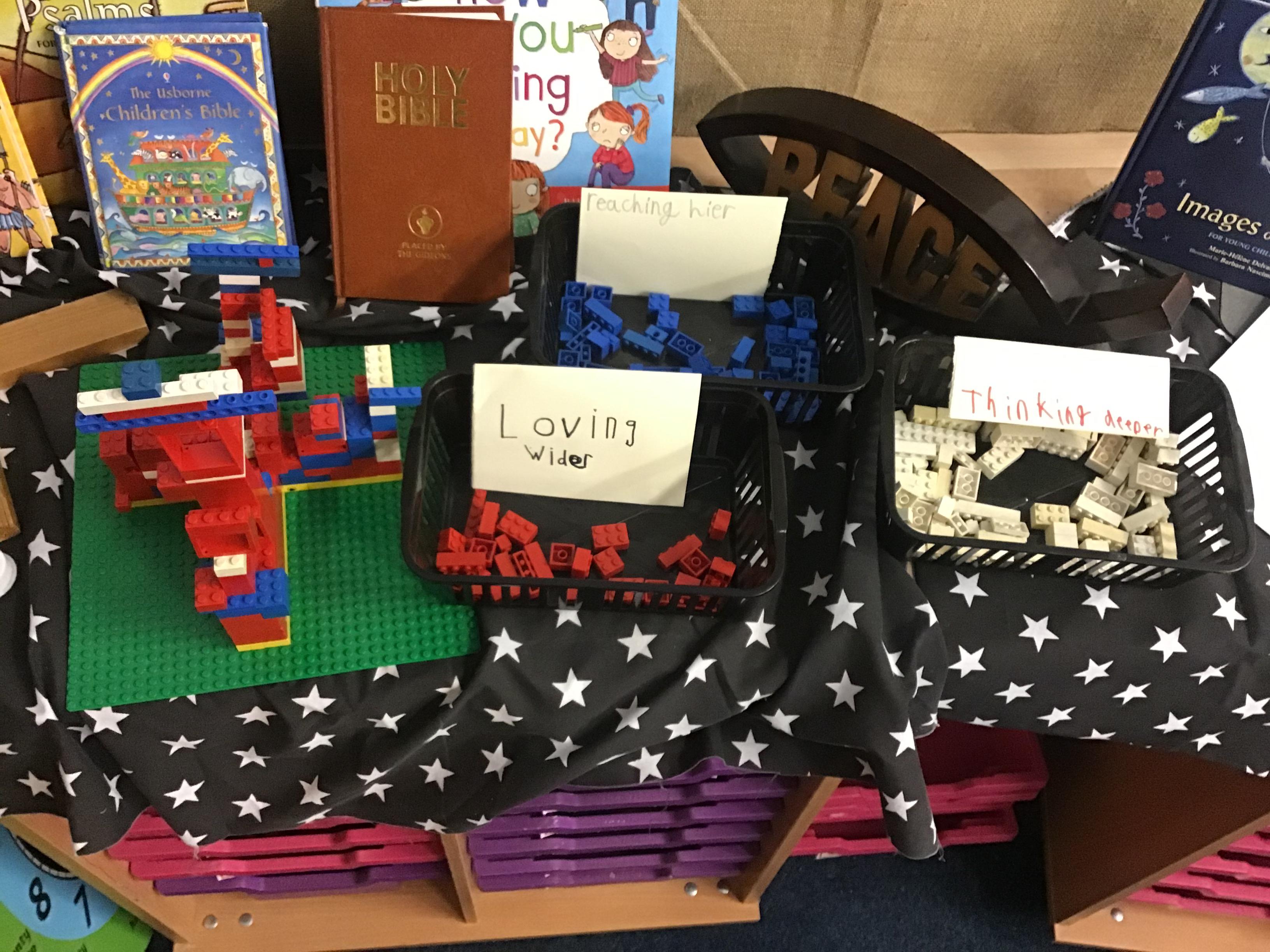 Each class has created a lego service cross. We used different coloured bricks to show acts of service we spotted from the teachers and children around school. Each colour of brick represented one of our school values of Reach Higher, Think Deeper, Love Wider. Which value do you think Emerald Class showed the most?